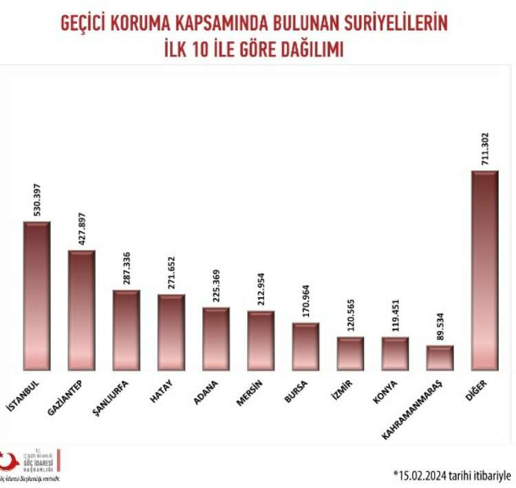 15 Şubat itibarıyla Suriyelilerin nüfusu, başta Erzurumlular ve Artvinller olmak üzere diğer illerin kütüğüne kayıtlı olup Bursa'da yaşayanların sayısını geçti.