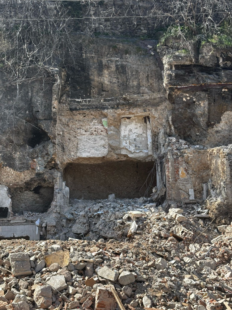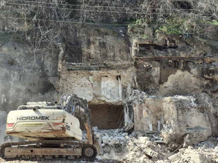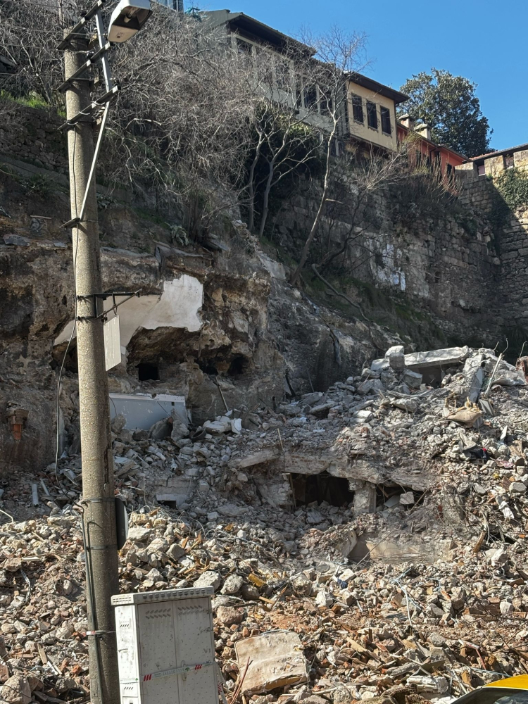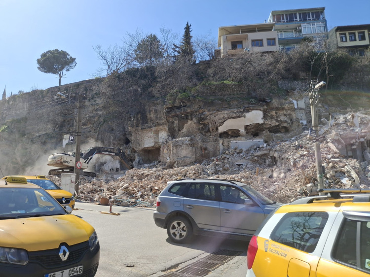 Bursa Tophane'de heyelan riski nedeniyle kamulaştırılan binaların yıkımının ardından tarihi surların işletmeler tarafından oyularak odaya dönüştürüldüğü ortaya çıktı.