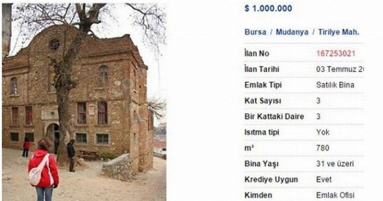 Bursa'nın turistik bölgelerinden Tirilye'de bulunan 19. yüzyıl dönemine ait Hagios Ioannes Rum Kilisesi (Yuannes Kilisesi) satışa çıktı.