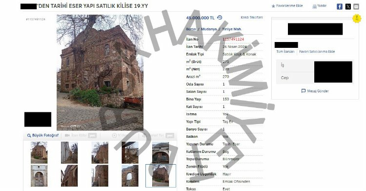 “Tarihi Eser Yapı Satılık Kilise 19.yy” başlığıyla verilen ilanda, kilise için 45 milyon TL bedel biçildi.