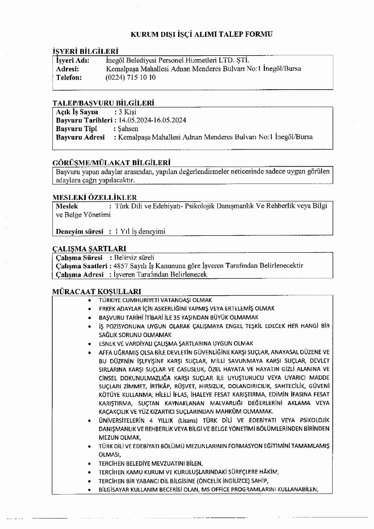 İnegöl Belediyesi, Gemlik Belediyesi ve Harmancık Belediyesi tek tek duyuru yayımlayarak belediye şirketlerine çok sayıda işçi alınacağını bildirdi.