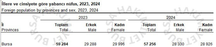 2023 yılında 59 bin 284 yabancının bulunduğu Bursa'da 2024 yılında 57 bin 256 ikamet izni olan yabancı olduğu açıklandı.