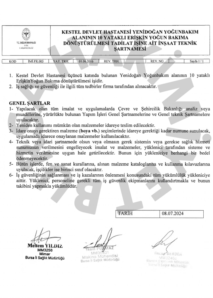 Sağlık Bakanlığı, Kestel Devlet Hastanesi'nin üçüncü katında bulunan yenidoğan yoğun bakım alanının, 10 yataklı erişkin yoğun bakıma dönüştürülmesi için ihale açtı.
