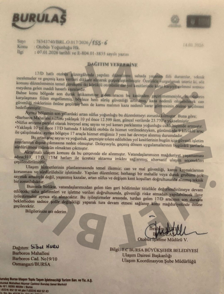BURULAŞ tarafından vatandaşlara gönderilen resmi yazıda ise güzergâh değişikliğinin teknik incelemeler ve saha verileri doğrultusunda yapıldığı belirtildi.