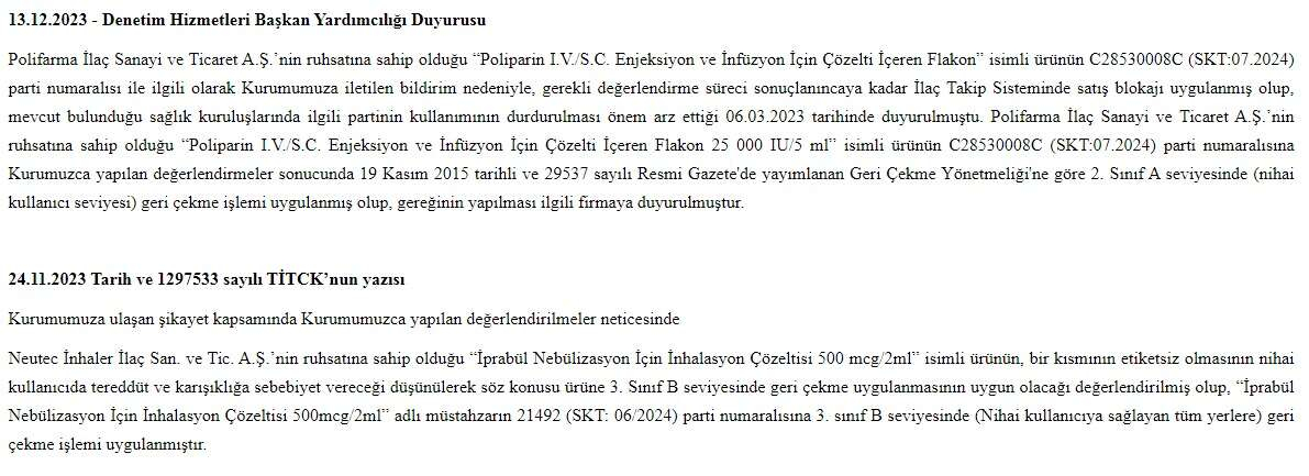 Polifarma İlaç Sanayi ve Ticaret A.Ş.’nin ruhsatına sahip olduğu “Poliparin I.V./S.C. Enjeksiyon ve İnfüzyon İçin Çözelti İçeren Flakon 25 000 IU/5 ml” ve Neutec İnhaler İlaç San. ve Tic. A.Ş.’nin ruhsatına sahip olduğu “İprabül Nebülizasyon İçin İnhalasyon Çözeltisi 500 mcg/2ml” ürünler hakkında geri çekme işlemi uygulandığı belirtildi.