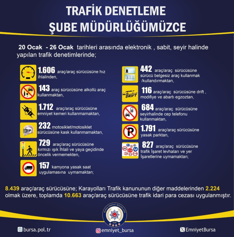 Bursa Emniyet Müdürlüğü tarafından yapılan paylaşımda 20 - 26 Ocak tarihleri arasında elektronik, sabit, seyir halinde trafik denetimleri gerçekleştirildiğini açıkladı.