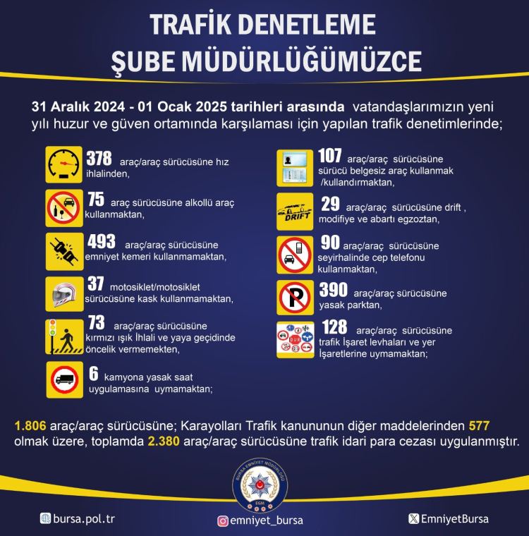 Bursa Emniyet Müdürlüğü tarafından yapılan paylaşımda 31 Aralık - 1 Ocak tarihleri arasında trafik denetimleri gerçekleştirildiğini açıkladı.