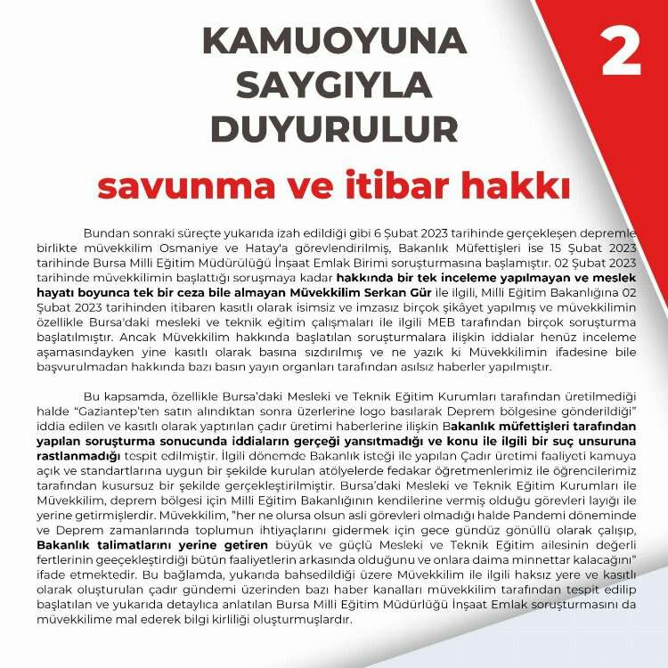 Bursa eski İl Milli Eğitim Müdürü Serkan Gür, hakkında açılan soruşturma kapsamında 28 Şubat 2023'te görevden alınarak Hatay'da görevlendirdi. Yerine başkası atanan Gür, 3 Mart 2023'te buradaki görevinden de alınarak merkeze çekildi.
