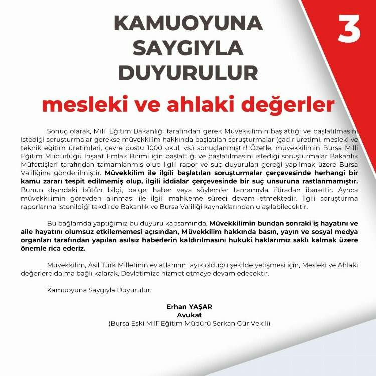 Bursa eski İl Milli Eğitim Müdürü Serkan Gür'ün avukatı Erhan Yaşar, müvekkili hakkında başlatılan soruşturmalar da herhangi bir suç unsuruna rastlanmadığını, bunun dışındaki bütün bilgi, belge, haber veya söylemlerin tamamıyla iftiradan ibaret olduğunu söyledi.