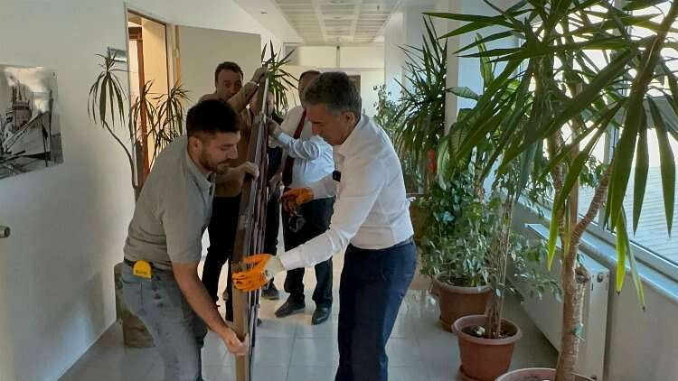 Konuşmasının ardından iş güvenliğinin önemine de vurgu yapan Deviren, makam kapısını kendi elleriyle söktü.
