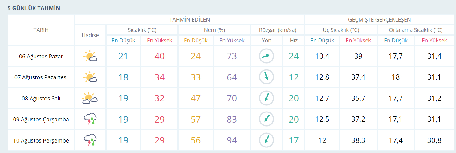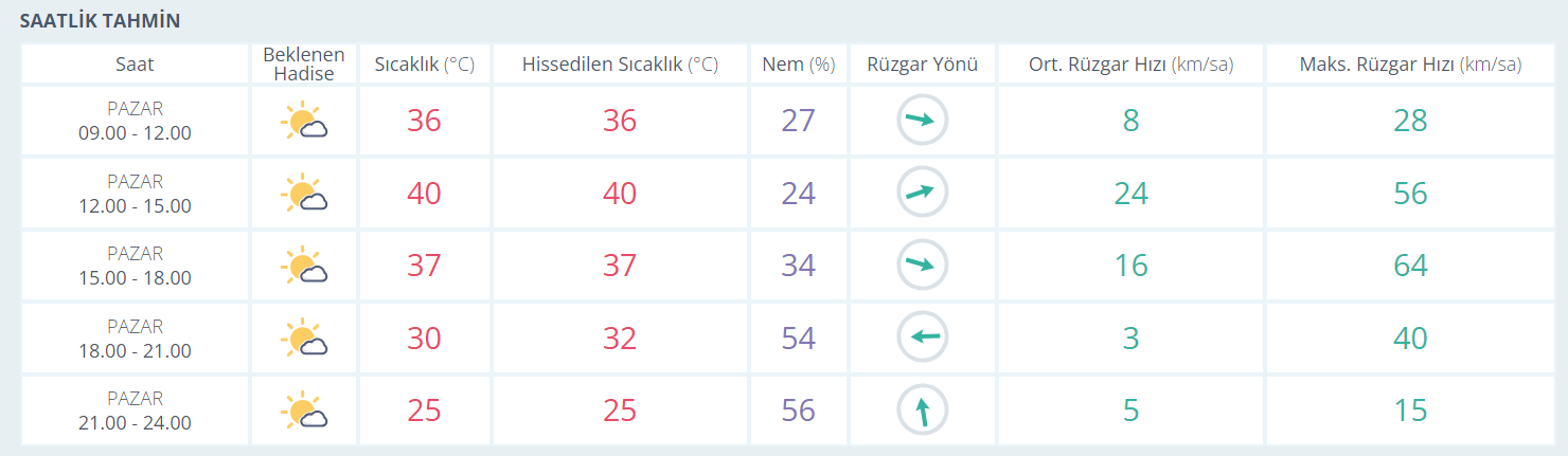 Akşam saatlerine doğru termometreler 37 derece olarak ölçülürken az bulutlu ve güneşli bir gökyüzüyle birlikte gün batımı yaşanıyor. Akşam saatlerinde açık bir gökyüzüyle birlikte hava sıcaklığı 30 derece seviyelerinde ölçülüyor. Gece saatlerinde de termometreler 25 derece seviyelerinde.