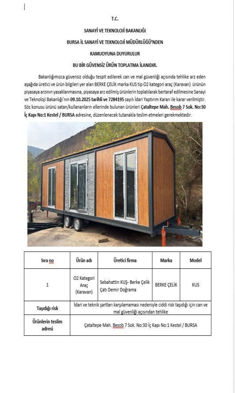 Bursa Sanayi ve Teknoloji İl Müdürlüğü, Sabahattin Kuş - Berke Çelik Çatı Demir Doğrama'nın ürettiği Berke Çelik marka KUS model karavanların idari ve teknik şartları karşılamaması nedeniyle ciddi risk taşıdığı için can ve mal güvenliği açısından tehlike taşıdığını duyurdu.