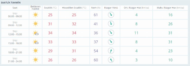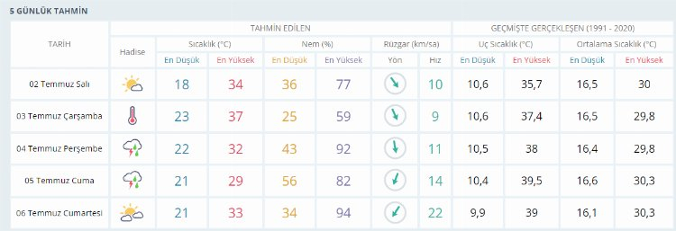 ÇARŞAMBA bunaltıcı sıcaklık 37 derece PERŞEMBE gökgürültülü sağanak yağışlı 32 derece CUMA gökgürültülü sağanak yağışlı 29 derece CUMARTESİ parçalı bulutlu ve güneşli 33 derece olacak.