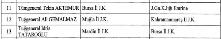 Yayımlanan karara göre Mardin İl Jandarma Komutanı Tuğgeneral İdris Tataroğlu yeni Bursa İl Jandarma Komutanı oldu. Mevcut Bursa İl Jandarma Komutanı Tümgeneral Tekin Aktemur Jandarma Genel Komutanlığı emrinde görevlendirildi.