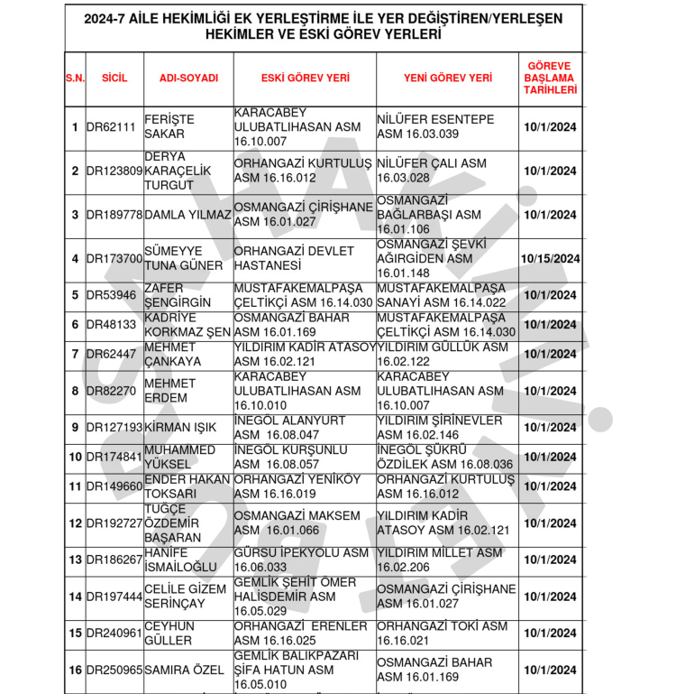 Bursa İl Sağlık Müdürlüğü duyurdu: Onlarca aile hekiminin görev yeri değişti