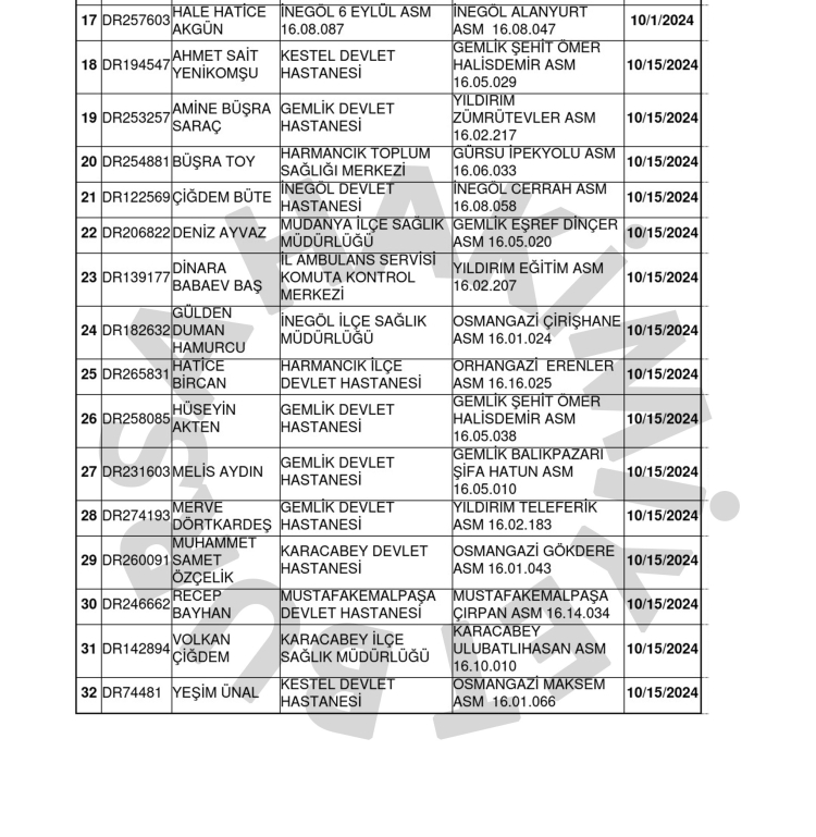 17 hekim 1 Kasım itibarıyla yeni görev yerlerinde işbaşı yaparken kalan 15 hekim 15 Ekim itibarıyla yeni görev yerlerinde mesaiye başlayacak.