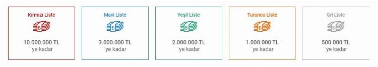 5 kategoriye ayrılan ödüllendirme listesinde; gri liste için 500 bin TL'ye kadar, turuncu liste için 1 milyon TL'ye kadar, yeşil liste için 2 milyon TL'ye kadar, mavi liste için 3 milyon TL'ye kadar, kırmızı liste için 3 milyon TL'ye kadar ödül dağıtılıyor.