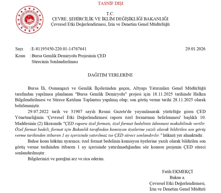 Söz konusu yazıda, “ÇED raporu özel formatı, özel format bedelinin ödenmesi mukabilinde verilir. Belirlenen süre içinde bedelin yatırılmaması halinde ÇED süreci sonlandırılır” hükmü hatırlatılarak, Bursa ili Osmangazi ve Gemlik ilçelerinden geçmesi planlanan demiryolu hattına ilişkin ÇED sürecinin bu nedenle kapatıldığı ifade edildi.