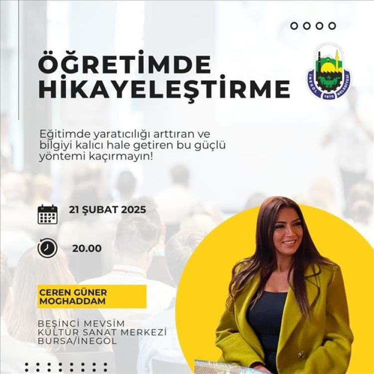 İnegöl Belediyesi, Ceren Güner Moghaddam’ın konuşmacı olarak katılacağı ve eğitimde yaratıcılığı arttıran, bilgiyi kalıcı hale getiren en güçlü yöntemlerden “Öğretimde Hikayeleştirme” semineri düzenliyor. Moghaddam, bu seminerde öğretimde hikayeleştirme tekniğinin tüm sırlarını paylaşacak.