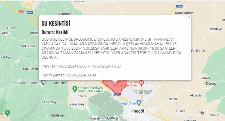 BUSKI Genel Müdürlüğümüz ıçmesuyu daıresı baskanlıgı tarafından yapılacak çalısmalar kapsamında Inegöl ılçesı Akhısar Mahallesı ve cıvarında 15.05.2024-15.06.2024 tarıhlerı arasında 09:00 - 18:00 saatlerı arasında zaman zaman su kesıntısı yapılacaktır. Tedbırlı olunması rica olunur.