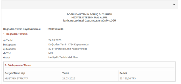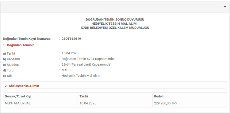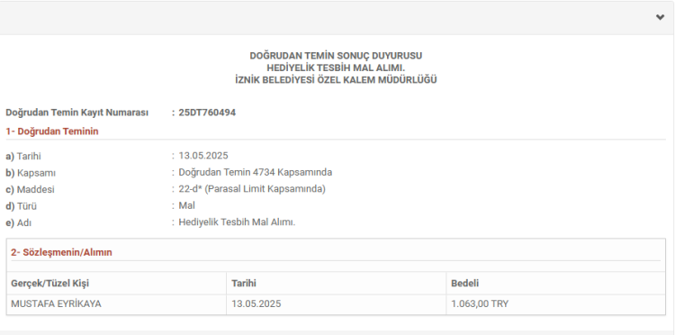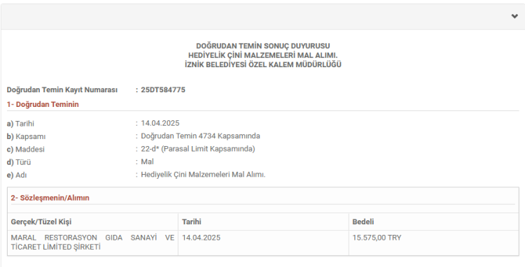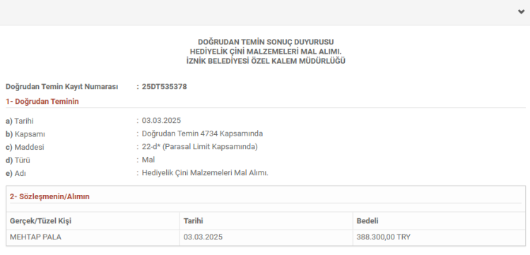 Öte yandan, İznik Belediyesi'nin çeşitli hediyelik eşya alımları da gündeme geldi. Belediyenin, ilçenin kültürel değerlerini tanıtmak amacıyla zeytin, zeytinyağı, çini ve tesbih gibi ürünleri doğrudan temin yöntemiyle tedarik ettiği öğrenildi.