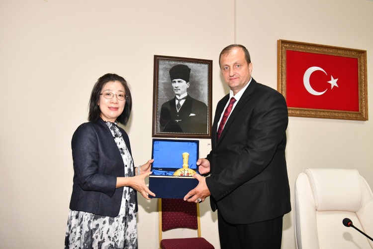 (İznik Belediye Başkanı Kağan Mehmet Usta, 2024 senesinde ziyarete gelen Çin heyetine ilçeyi temsil eden hediyeler takdim ediyor. )