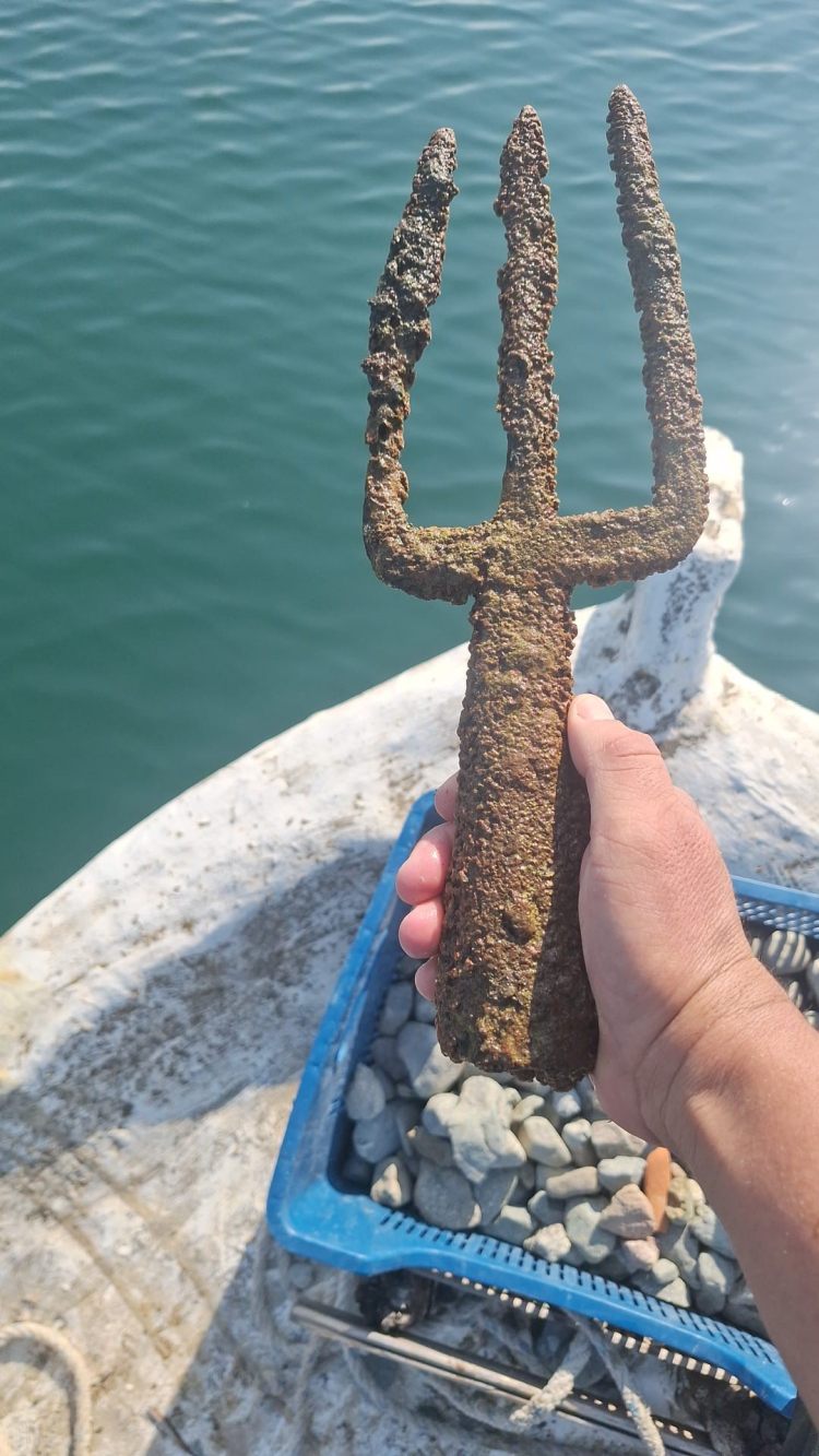 Kıyıya yanaşan balıkçı Erim, mızrak ucunu teslim etmek için müze müdürlüğü yetkililerine haber verdi.