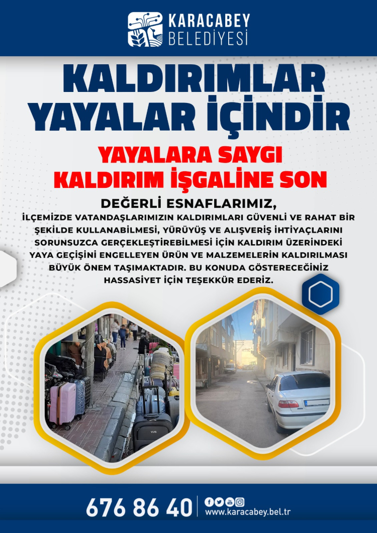 Karacabey Belediye Başkan Yardımcısı A.Celal Gürer konuyla ilgili yaptığı açıklamada ‘’Zabıta Müdürümüz Murat Kuşaklı ve Zabıta müdürlüğümüze bağlı birim ekibi arkadaşlarımızla birlikte yol ve kaldırım işgalinin önüne geçebilmek için ilçe genelinde şikayetlerin artması sonucu çalışmalarımızı başlattık. Denetimlerimizde konuyla ilgili bilinçlendirmeyi artırmak amacıyla Karacabey Belediyesi olarak kaldırım işgaline dikkat çekmek için hazırladığımız el broşürlerinin de dağıtımını gerçekleştirdik. İlçemizde ki vatandaşlara karşı kaldırımların daha güvenli yürüyüş alanları oluşturması gerektiğini ve rahat alışveriş yapabilmeleri için kaldırım üzerindeki yaya geçişini engelleyen ürün ve malzemelerin kaldırılmasının büyük önem taşıdığını vurgulamaya çalıştık. Duyarlı davrandıkları için esnaflarımıza da teşekkür ediyorum. Denetimlerimiz aralıksız devam edecek, kaldırım işgaline de asla müsaade etmeyeceğimizi belirtmek isterim’’. dedi