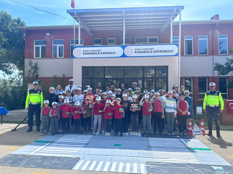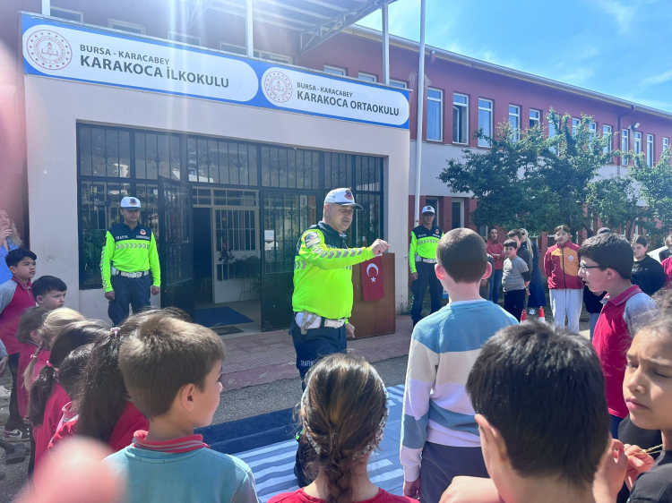 Bursa'nın Karacabey ilçesindeki Karakoca İlköğretim Okulu'nda, Trafik Haftası kapsamında çocuklara güvenli trafik eğitimi verildi.