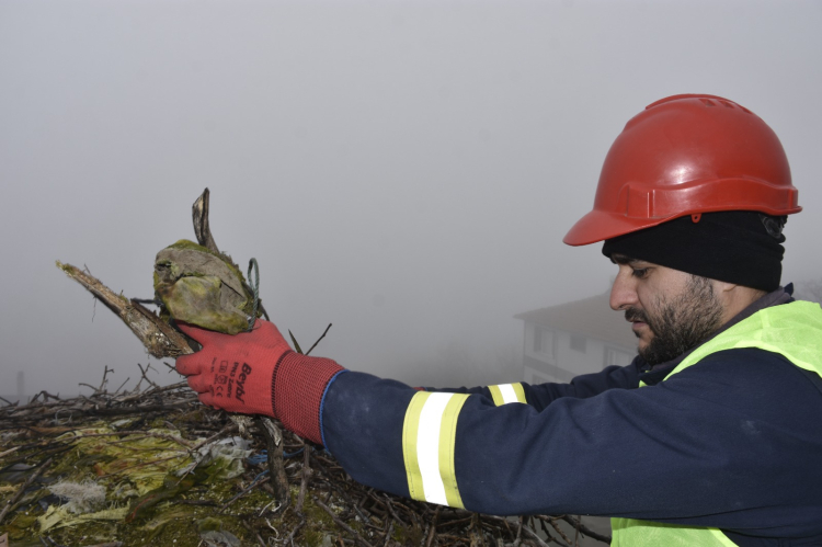 Bursa Karacabey'deki leylek yuvalarında geleneksel temizlik devam ediyor
