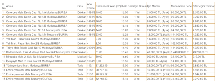 Bursa Mudanya Belediye Başkanlığı, mülkiyeti belediyeye ait olan 11 dükkanı, 4 tarlayı ve bir meskeni aylık 400 TL'den başlayan fiyatlarla kiraya vereceğini açıkladı. İşte o taşınmazlar...