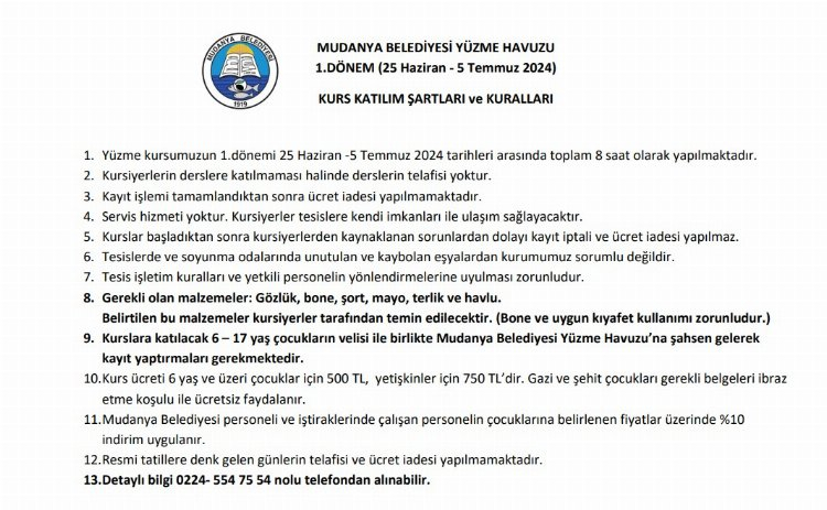 Mudanya Belediyesi yüzme havuzunda yaz sezonu başlıyor. Serbest kullanımın yanı sıra hem çocuklar hem de yetişkinler için yüzme kursları da açılacak.
