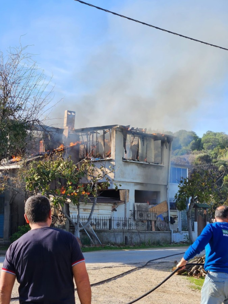 Bursa'nın Mudanya ilçesinde çıkan yangında bir ev küle dönerken, yanındaki bina da alevler ve söndürme esnasındaki su sebebiyle hasar gördü.