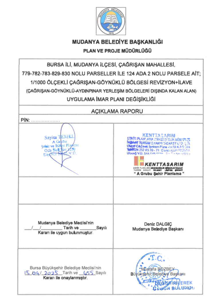 Çağrışan mahallesindeki 779-782-783-829-830 nolu parseller ile 124 ada 2 parsele ait; 1/1000 ölçekli Çağrışan - Göynüklü Bölgesi Revizyon + İlave (Çağrışan - Göynüklü - Aydınpınar Yerleşim Bölgeleri Dışında Kalan Alan) Uygulama İmar Planı Değişikliği, Mudanya Belediye Meclisi tarafından uygun bulunmuştu.