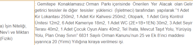 Gemitepe Konaklamasız Orman Parkı içerisinde; önerilen yer alacak olan gelir getirici tesisler ile diğer tesisler yüklenici (İşletmeci) tarafından yapılarak “1 Adet Kır Lokantası 250m2, 1 Adet Kır Kahvesi 250m2, Otopark, 1 Adet Giriş Kontrol Ünitesi 12m2, 6 Adet Kameriye 18m2, 1 Adet WC (2E+1B+1EN) 30m2, 3 Adet Seyir Terası 40m2, 1 Adet Çocuk Oyun Alanı 40m2, Tel İhata, Mevcut Taşıt Yolu, Yürüyüş Yolu, Plan Onay Sınırı” 6831 Sayılı Orman Kanunu’nun 25 ve Ek 8’inci maddesi uyarınca kiraya verilmesi.