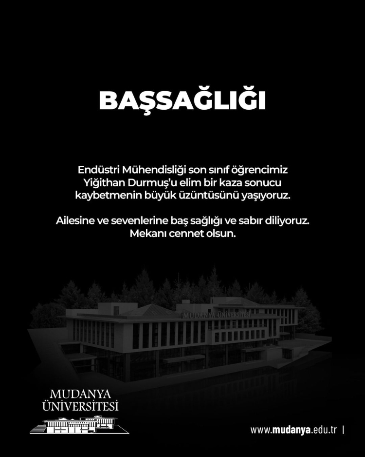 Bursa’da eğitim veren Mudanya Üniversitesi, Endüstri Mühendisliği son sınıf öğrencisi Yiğithan Durmuş’un elim bir kaza sonucu hayatını kaybettiğini duyurdu.