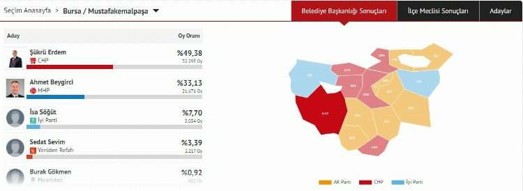 Kesin olmayan sonuçlara göre CHP'nin adayı Şükrü Erdem, Bursa Mustafakemalpaşa Belediye Başkanı oldu.