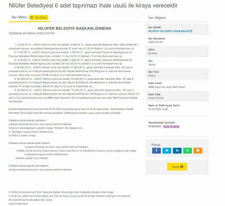 Bursa Nilüfer Belediye Başkanlığı, mülkiyeti belediyeye ait olan 6 adet taşınmazın 2 bin TL'den başlayan fiyatlarla kiraya verileceğini duyurdu.