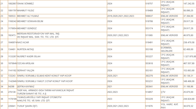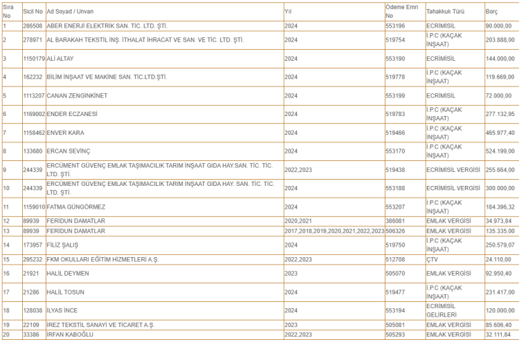 Ayrıca FKM Okulları Eğitim Hizmetleri Anonim Şirketi de 2022 ve 2023 yıllarına dair ÇTV'sini ödemediği için listeye girdi.