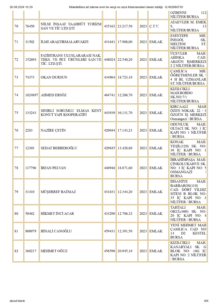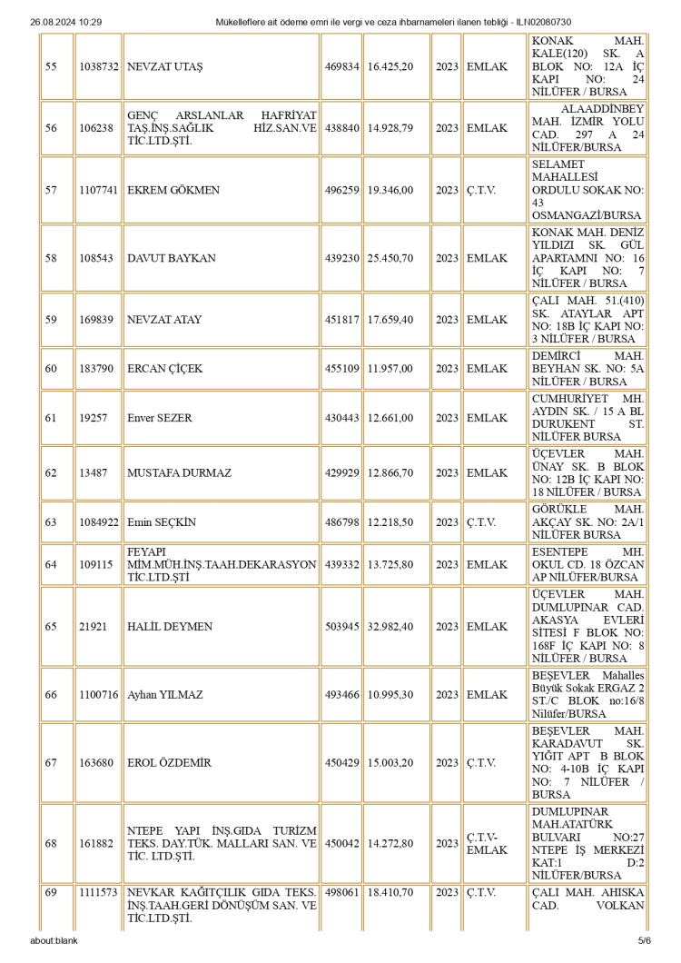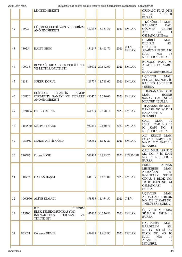 Belediye tarafından yapılan açıklamada, "Belediyemiz mükelleflerinden olup, aşağıda adı soyadı, ünvanı belirtilen mükellefler adına tanzim olunan ödeme emirleri, mükelleflerin bilinen adresinde bulunamaması nedeniyle tebliğ edilemediğinden, 213 sayılı V.U.K.'nun 103-106 maddelerine göre iş bu ilan tarihinden başlayarak 1 ay içinde Belediyemize bizzat veya bilvekale müracaat etmeleri yada taahütü mektup veya telgrafla, açık adreslerini bildirmeleri halinde kendilerine süre ile kayıtlı tebliğ yapılacağı; 1 aylık sürenin bitiminde müracaat ile adreslerini bildirmeleri halinde ise bu ilanın yayın tarihinden itibaren 1 ayın sonunda tebliğ yapılmış sayılacağı ilan olunur." ifadeleri kullanıldı.