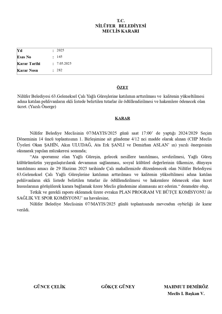 “Ata sporumuz olan Yağlı Güreşin, gelecek nesillere tanıtılması, sevdirilmesi, Yağlı Güreş kültürümüzün yaygınlaştırılarak devamının sağlanması, sosyal kültürel değerlerinin ülkemize, dünyaya tanıtılması amacı ile 29 Haziran 2025 tarihinde Çalı mahallemizde düzenlenecek olan Nilüfer Belediyesi 63. Geleneksel Çalı Yağlı Güreşlerine katılımın arttırılması ve kalitenin yükseltilmesi adına katılan pehlivanların ekli listede belirtilen tutarlar ile ödüllendirilmesi ve hakemlere ödenecek olan ücret hususlarının görüşülerek karara bağlamak üzere Meclis gündemine alınmasını arz ederim.“ ifadelerinin yer aldığı önerge, tetkik ve gerekli raporu eklenmek üzere evrakın Plan Program ve Bütçe Komisyonu ile Sağlık ve Spor Komisyonu’na havalesine, mevudun oybirliği ile karar verildi.