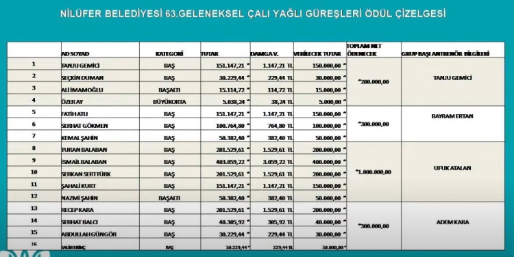 Bursa Nilüfer Belediye Meclisi, bu yıl 63'üncüsü düzenlenecek Geleneksel Tarihi Çalı Güreşleri'nde katılımcılara verilmesi planlanan destekleri duyurdu. İşte güreşçilere verilecek ödül miktarları...