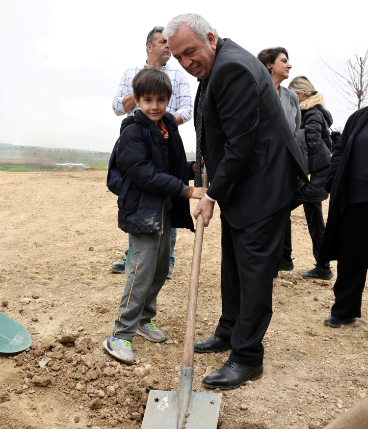 Nilüfer Belediye Başkanı Şadi Özdemir de alanda gruplar halinde ayrılan çocuklarla birlikte, çınar fidanlarını toprakla buluşturdu. Ardından Başkan Şadi Özdemir, çocuklarla fidanlara can suyunu verdi.