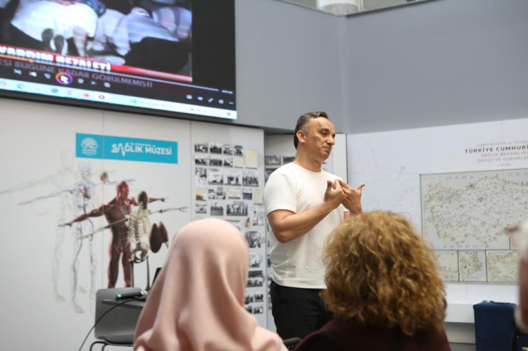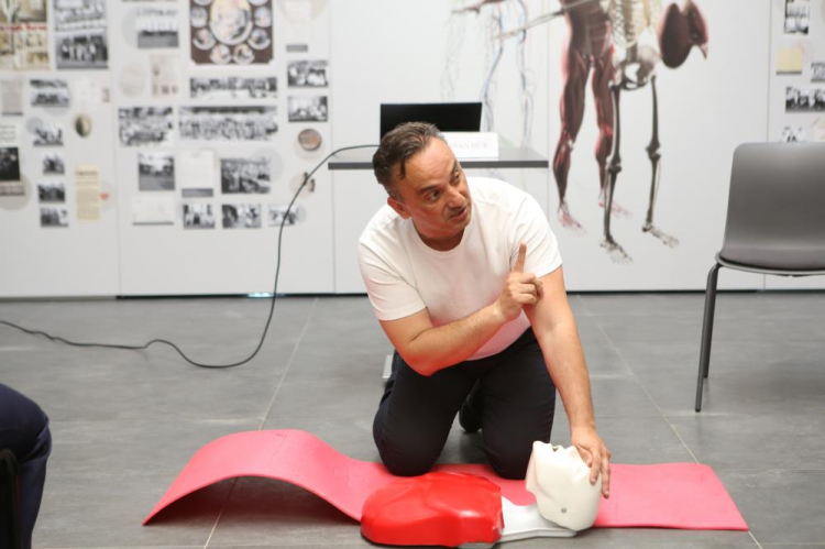 Nilüfer Belediyesi Dr. Ceyhun İrgil Sağlık Müzesi’nde gerçekleşen etkinlikte İş Güvenliği ve İlk Yardım Uzmanı Hasan Hür, doğru ilk yardım müdahaleleri hakkında bilgi vererek uygulamalı olarak gösterdi.