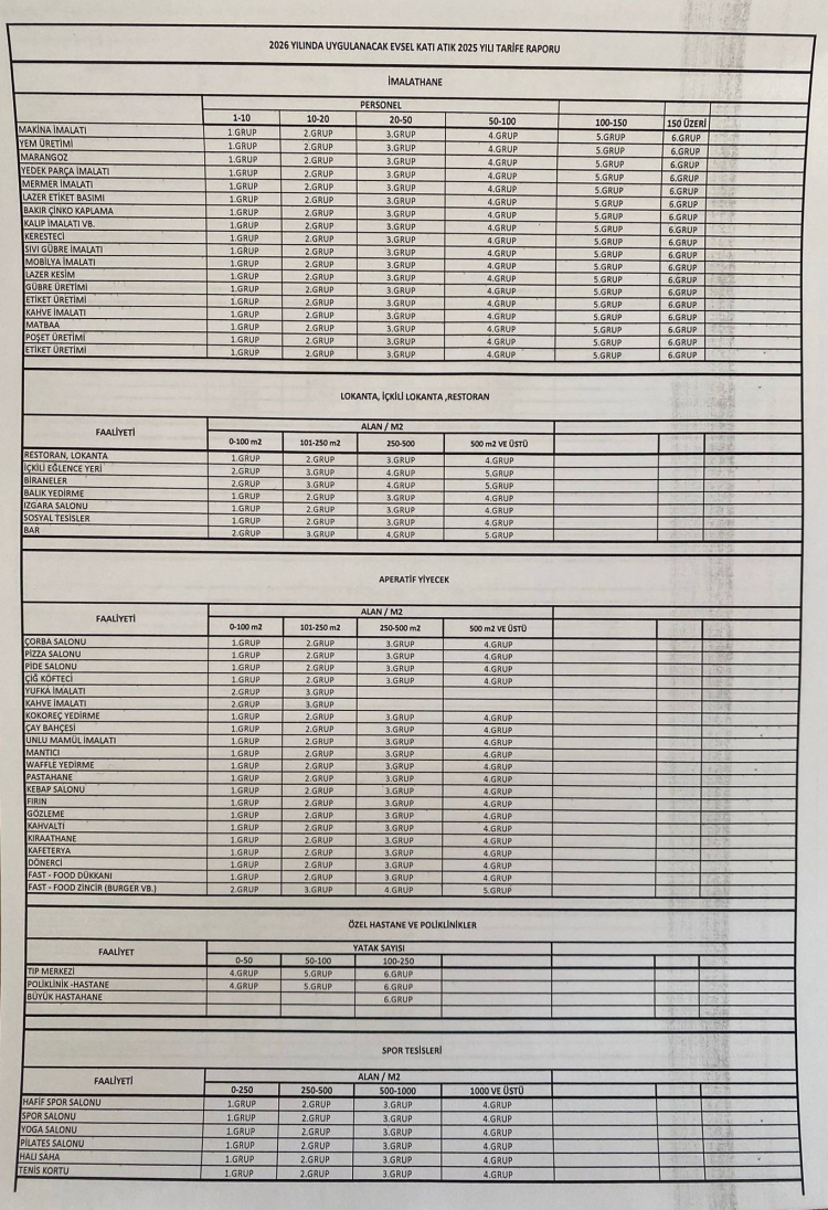 Raporda, "Bursa Büyükşehir Belediye Meclisince alınan 23.05.2017 tarih ve 2016/1098-2017/247.572 Esas 1521 Sayılı karar gereği, 2025 yılı Evsel Katı Atık toplama maliyetinin Bursa Büyükşehir Belediyesi tarafından 2026 yılında tahakkuk ve tahsilatı yapılmak üzere ekli tarifelerin konut ve küçük işletme dışında kalan işyerlerinden sözleşme yapılması koşuluyla ait olduğu gruptan Atıksu Altyapı ve Evsel Katı Atık Bertaraf Tesisleri Tarifelerinin Belirlenmesinde Uyulacak Usul ve Esaslara İlişkin Yönetmelik gereği tahakkuk ve tahsilin uygun olduğuna Komisyonlarımızca karar verilmiştir." ifadelerine yer verildi.