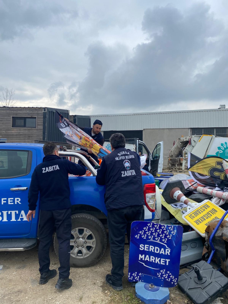 Bursa Nilüfer Belediyesi zabıta ekipleri, Görükle, Beşevler, 29 Ekim Mahallelerinde cadde ve kaldırımlarda yaya geçişini engelleyen duba, bayrak gibi materyalleri topladı.