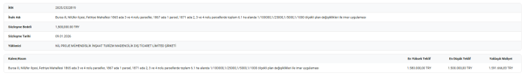 Edinilen bilgilere göre, “Bursa İli, Nilüfer İlçesi, Fethiye Mahallesi 1865 ada 3 ve 4 nolu parseller, 1867 ada 1 parsel, 1871 ada 2, 3 ve 4 nolu parsellerde toplam 6.1 ha alanda 1/100000, 1/25000, 1/5000 ve 1/1000 ölçekli plan değişiklikleri ile imar uygulaması” ihalesi, pazarlık usulü (MD 21 F) ile 24 Aralık 2025 tarihinde gerçekleştirildi.