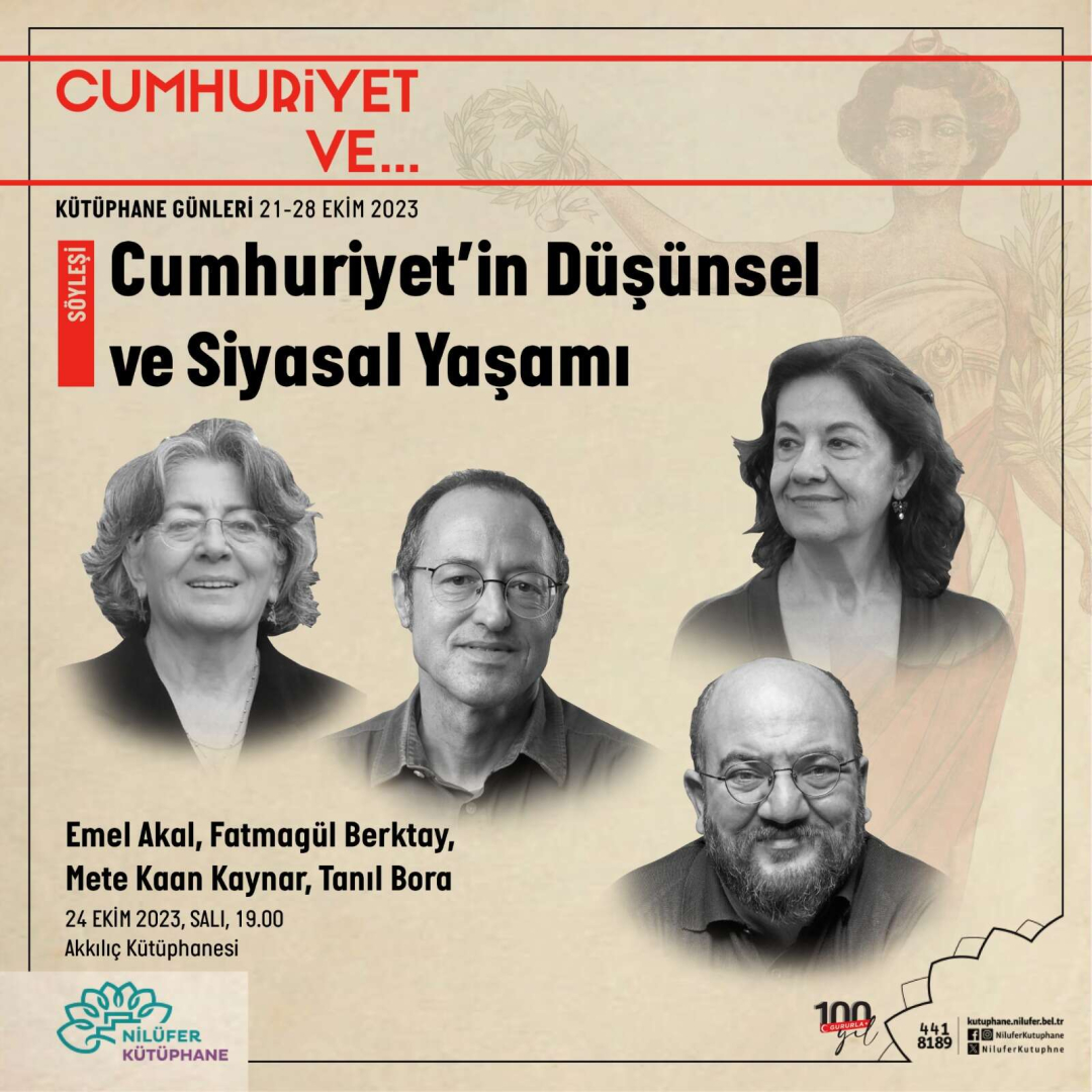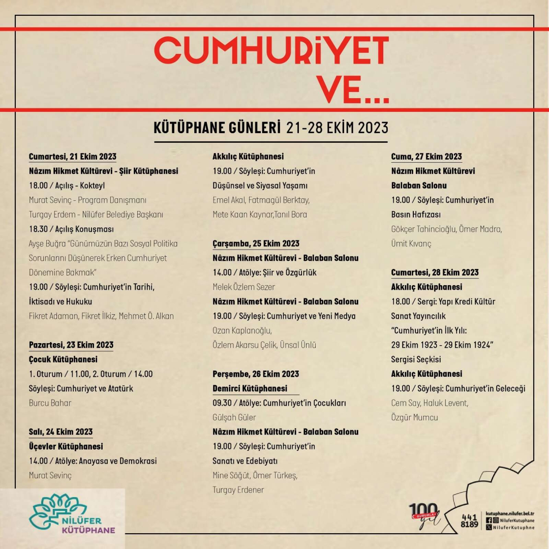 23 Ekim Cumartesi günü Çocuk Kütüphanesi’nde gerçekleştirilecek buluşmada Burcu Bahar “Cumhuriyet ve Atatürk” üzerine çocuklarla söyleşirken, 24 Ekim Salı günü Üçevler Kütüphanesi’nde düzenlenecek atölyede de Murat Sevinç, “Anayasa ve Demokrasi”yi konu alacak. Aynı gün saat 19.00’da Akkılıç Kütüphanesi’nde gerçekleştirilecek “Cumhuriyet’in Düşünsel ve Siyasal Yaşamı” söyleşisine de Emel Akal, Fatmagül Berktay, Mete Kaan Kaynar ve Tanıl Bora konuk olacak.