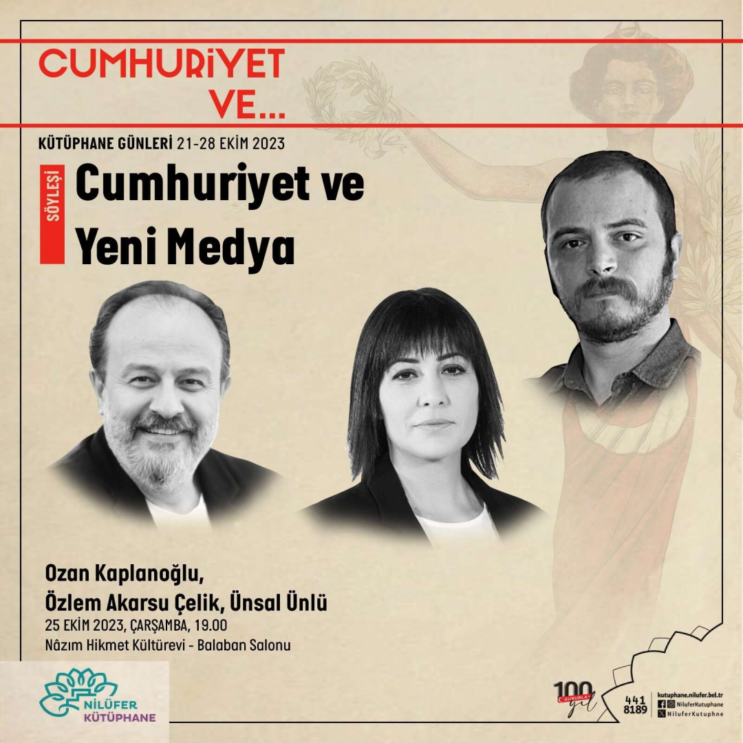 Nilüfer Kütüphane Günleri çerçevesinde 25 Ekim Çarşamba günü Nazım Hikmet Kültürevi Balaban Salonu’nda Melek Özlem Sezer’in katılımıyla “Şiir ve Özgürlük” atölyesi ile Ozan Kaplanoğlu, Özlem Akarsu Çelik ve Ünsal Ünlü’nün konuşmacı olarak yer alacağı “Cumhuriyet ve Yeni Medya” söyleşisi gerçekleştirilecek.