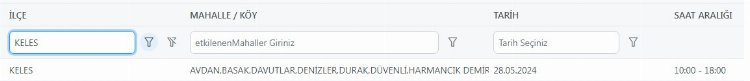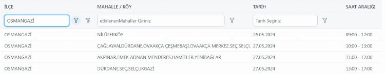 Elektrik dağıtım şirketi UEDAŞ tarafından yapılan duyuruda, "Şebeke çalışması sebebiyle Bursa'da belirtilen adreslerde enerji kesintisi uygulanacaktır. Yapılacak olan çalışmanın erken bitmesi halinde planlanan bitiş saatinden önce enerji verilecektir." ifadelerine yer verildi.